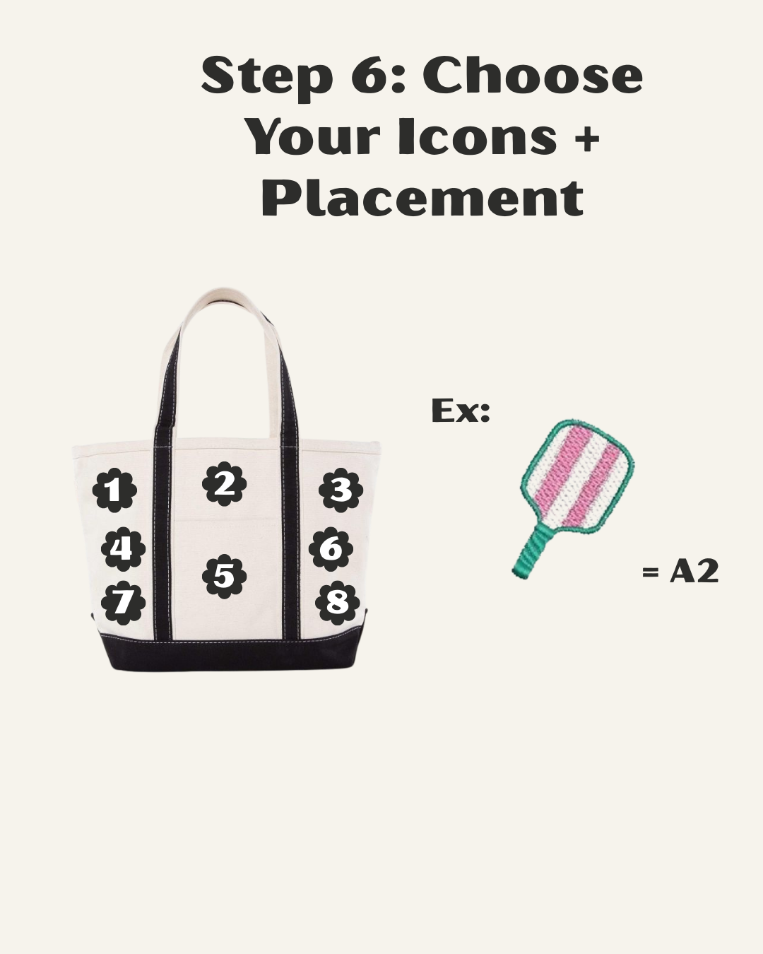 Example: Placement #1 - Icon A2 | Placement #2 - Monogram | Placement #3 - Icon C3 | Placement #4 - Icon B4 | Placement #5 - Icon D5 | Placement #6 - Icon D2 | Placement #7 - Icon C1 | Placement #8 - Icon B3